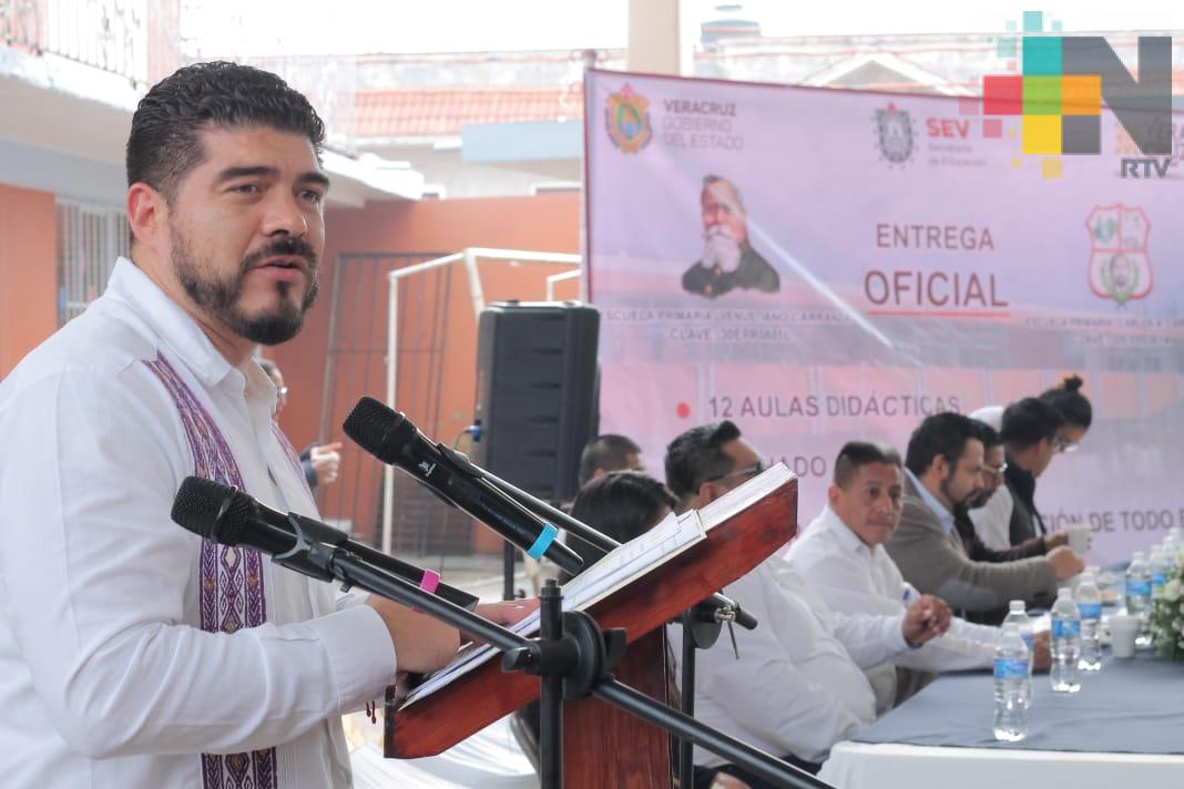 Coscomatepec, Ver.- La Secretaría de Educación de Veracruz (SEV), a través del Instituto de Espacios Educativos (IEEV), entregó 12 aulas, trabajos de techado, pintura e impermeabilización en la Primaria «Venustiano Carranza», para beneficio de mil 200 alumnos de la localidad Xocotla, en este municipio.