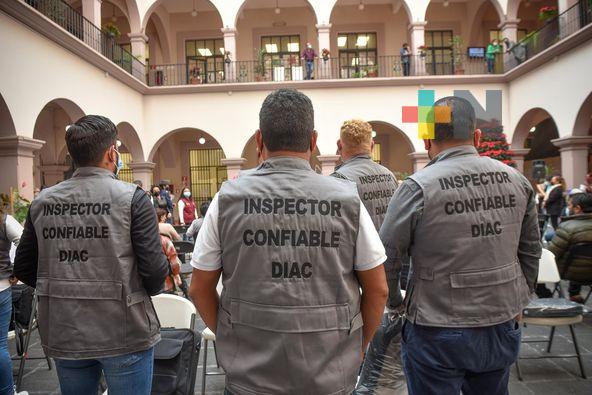 Xalapa, Ver.- Para poner al Ayuntamiento a la vanguardia estatal en la implementación de medidas para transparentar procedimientos administrativos históricamente cuestionados por la ciudadanía, se entregó equipo y constancias a personal del Departamento de Inspección y Atención Comercial (DIAC) que participó en el programa Inspectores Confiables.