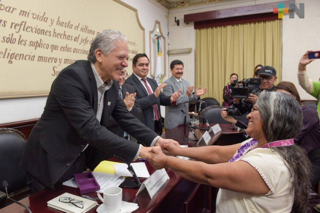 Xalapa, Ver.- En el marco de la conmemoración del Día Internacional de la Mujer, en Sesión Solemne, integrantes del Cabildo entregaron la Medalla Insurgente María Teresa de Medina y Miranda a la ciudadana Rosalba Campos Velázquez por su trabajo en favor de los derechos humanos y la igualdad de género.