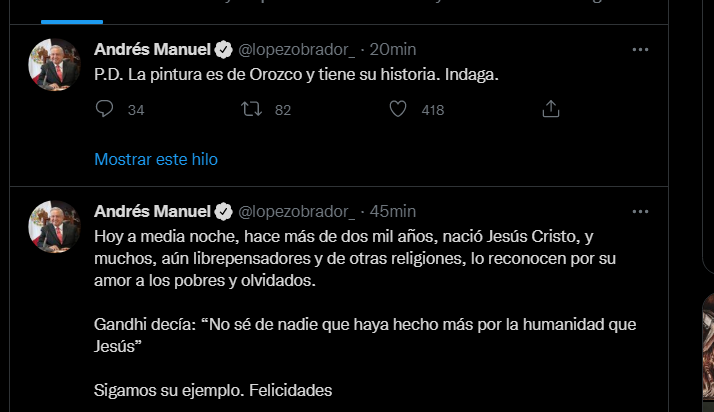 El Presidente de México, en un segundo tuit, escribió: «P.D. La pintura es de Orozco y tiene su historia. Indaga».