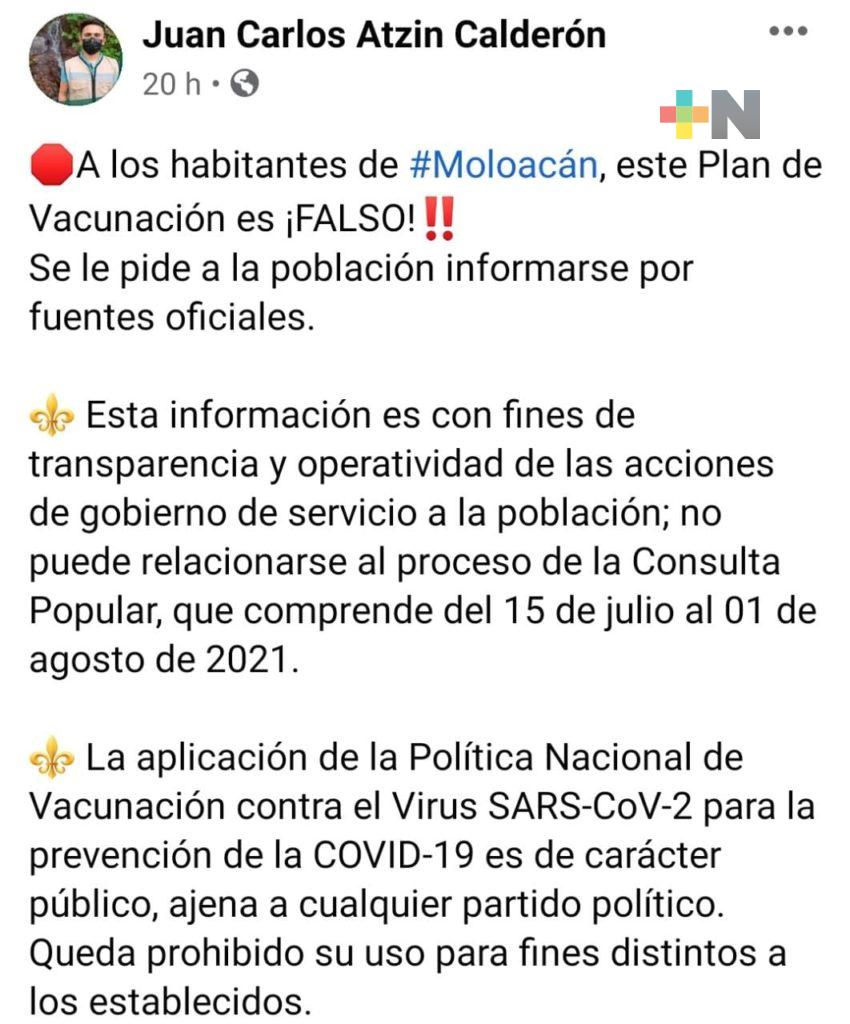 Es falso que ya haya fecha para vacunar a personas de 18 a 39 años en Moloacán: Juan Carlos Atzin