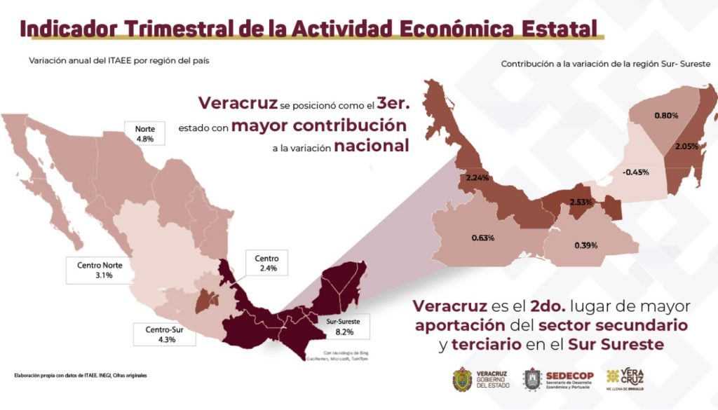 Xalapa, Ver.- La zona del Sur-Sureste del país, es la región que presentó mayor crecimiento, con un 8.2%, de acuerdo al Indicador Trimestral de la Actividad Económica Estatal, mostrando la eficiencia de las políticas públicas diseñadas por el Gobierno de México y la gran participación económica que registra el Estado de Veracruz, así lo informó a través de sus redes sociales la Secretaría de Desarrollo Económico y Portuario del Estado de Veracruz (Sedecop).