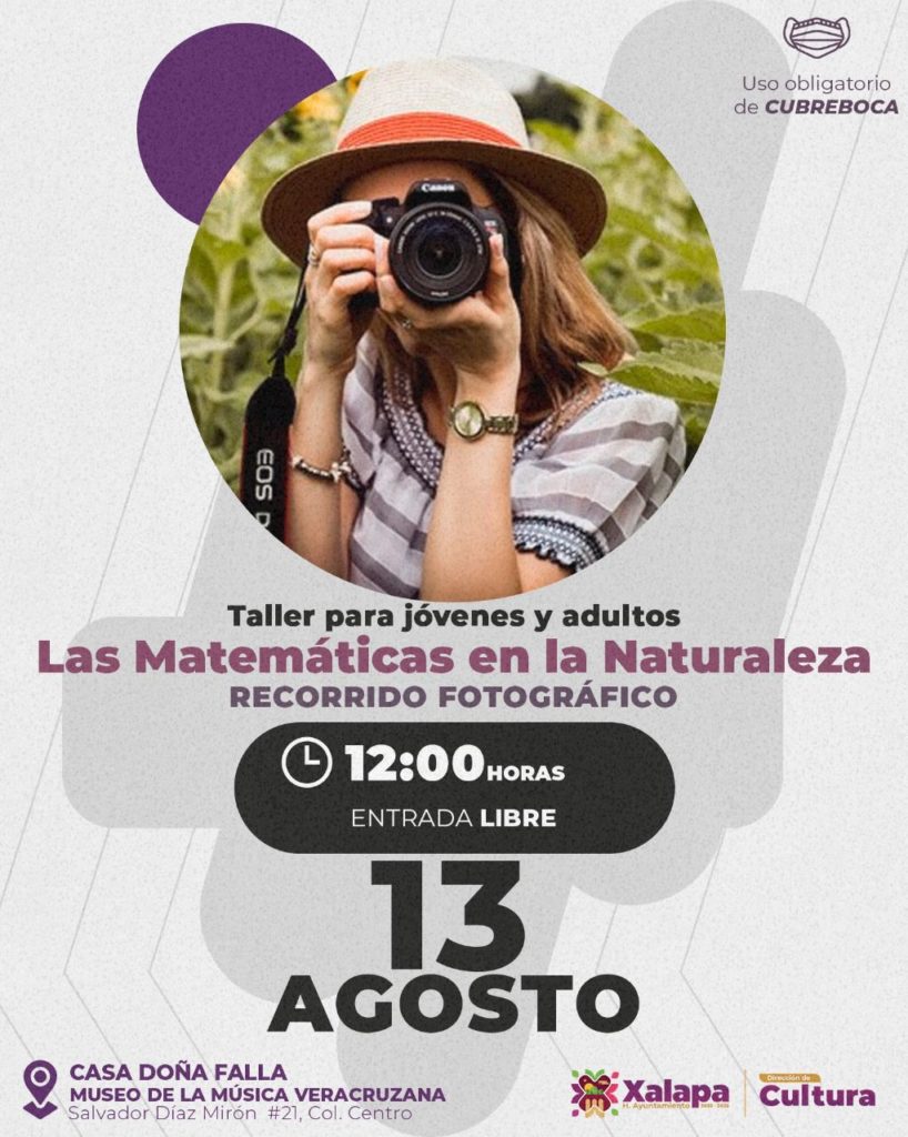 El sábado 13 de agosto seguirán los talleres de ajedrez, jarana, leona, son, telar de cintura y zapateado, de 11:00 a 14:00 horas, en el Centro Recreativo Xalapeño; y a las 12:00 horas, en el Museo de la Música Veracruzana, Casa Doña Falla, el taller “Las matemáticas en la naturaleza”, con un recorrido fotográfico.