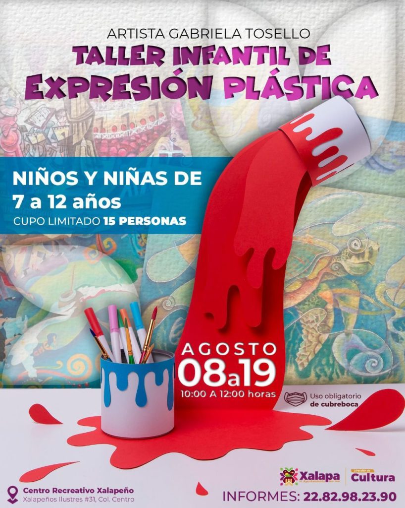 Otras de las actividades programadas por la Dirección de Cultura son los talleres de expresión plástica dirigidos a niños. Se desarrollarán hasta el próximo 19 de agosto en el Centro Recreativo Xalapeño, de 10:00 a 12:00 horas.