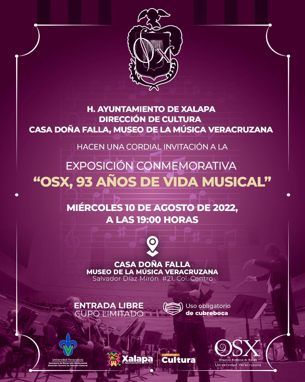 Este último día, a 19:00 horas, en el Museo de la Música Veracruzana, Casa Doña Falla, se inaugurará la exposición conmemorativa: “OSX, 93 años de vida musical”. La entrada será gratuita.