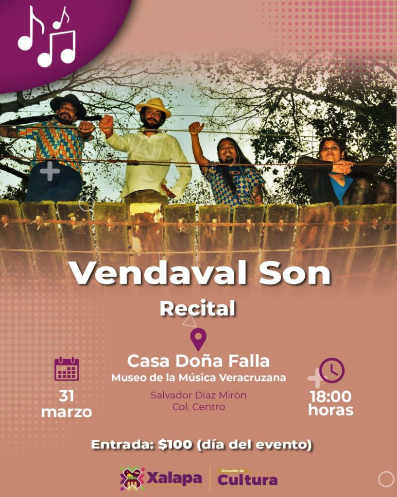 De igual manera, este día, a las 11:00 horas, en el Centro Recreativo Xalapeño (CRX), Atanasio García Durán ofrecerá la conferencia magistral: «Xalapa: Historia y Tradición Educativa. Nueva Escuela Mexicana»; a las 18:00 horas, Vendaval Son ofrecerá un recital en la Casa Doña Falla, Museo de la Música Veracruzana.