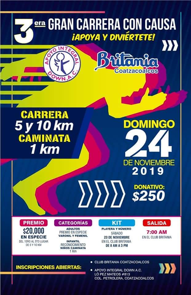 Coatzacoalcos, Ver.- Este domingo 24 de noviembre se realizará en Coatzacoalcos la tercera gran carrera con causa, a favor de Apoyo Integral Down, por ello el comité organizador se encuentra ultimando detalles rumbo a este circuito pedestre para las categorías infantil y adultos.