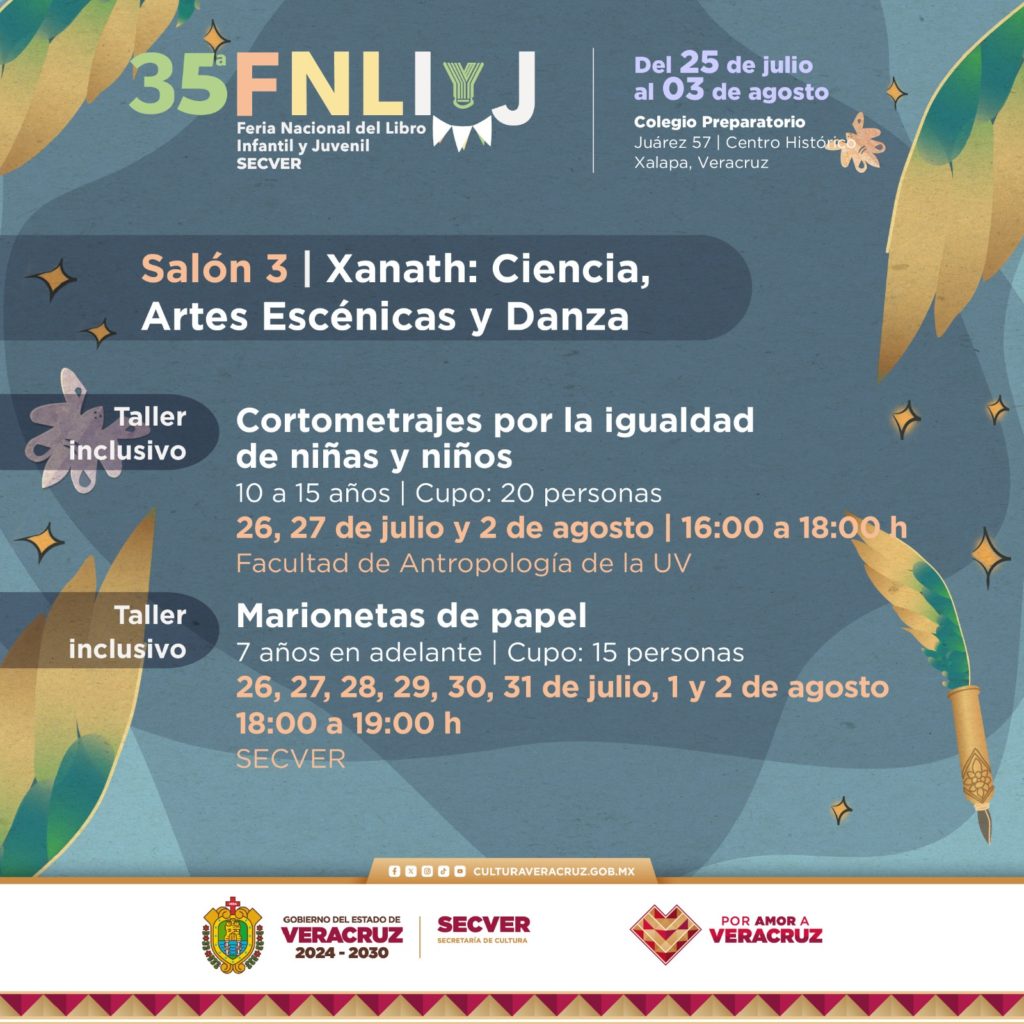 Xalapa, Ver.- La Secretaría de Cultura de Veracruz (Secver) invita a las actividades de la 35ª Feria Nacional del Libro Infantil y Juvenil. Habrá presentaciones de libros, conciertos, danza, charlas y talleres a partir de las 11:00 horas en el Colegio Preparatorio de Xalapa. La oferta de actividades es completamente gratuita y apta para todo el público.