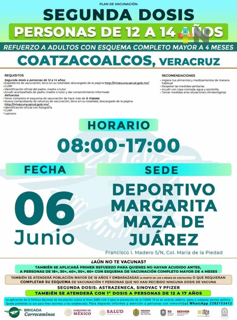 Coatzacoalcos, Ver.- Este lunes seis de junio se aplicará en el municipio de Coatzacoalcos la segunda dosis en menores de 12 a 14 años y la vacuna de refuerzo entre la población adulta con cuatro meses o más de haber completado su esquema de vacunación.