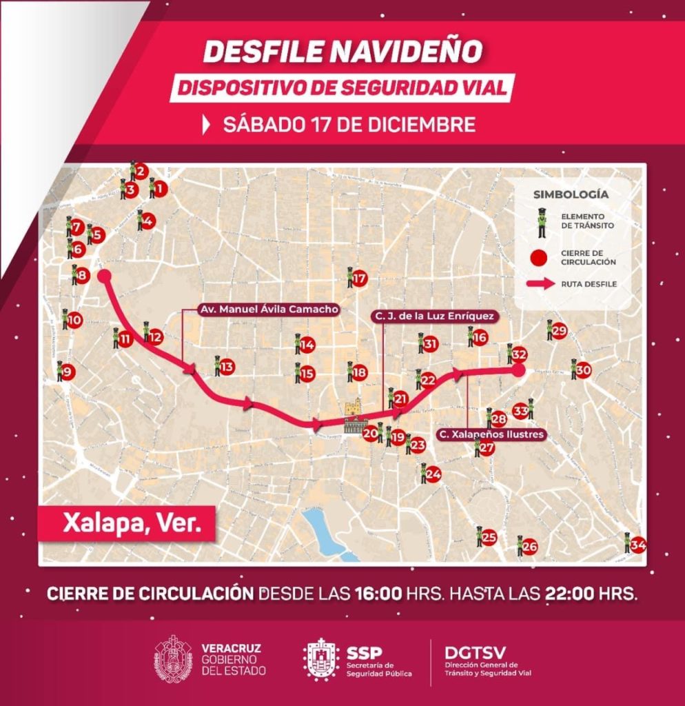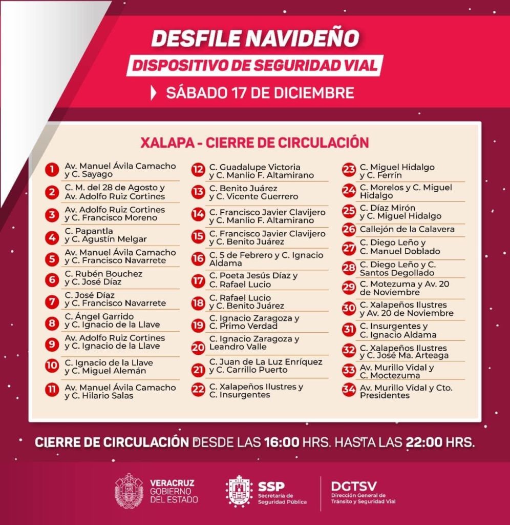 Xalapa, Ver.- Como parte de los festejos del Orgullo Navideño 2022 se realizará el Desfile Iluminado, por lo que la Dirección General de Tránsito y Seguridad Vial del Estado (DGTSV) informa que llevará a cabo cortes a la circulación en la zona centro de esta ciudad, este sábado 17 de diciembre a partir de las 16:00 horas y hasta las 22:00 horas.