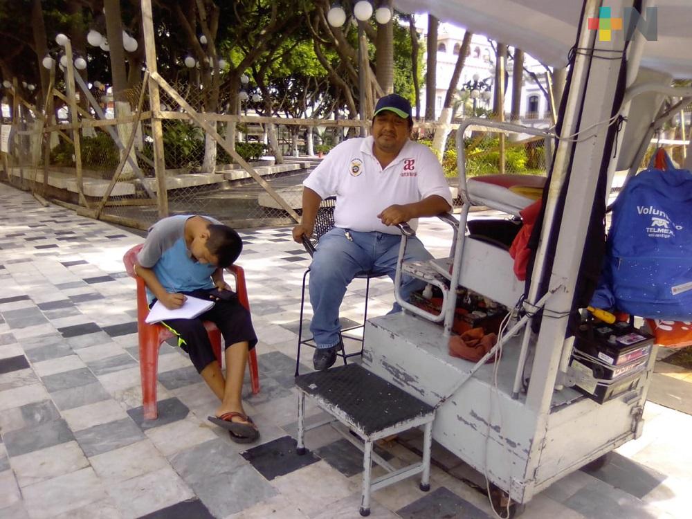 Veracruz, Ver.- Para poder continuar con sus estudios, algunos estudiantes de la ciudad de Veracruz deben tomar medidas especiales, uno de ellos es José Gabriel, un estudiante de sexto año de primaria que debe ir al zócalo en el Centro Histórico para poder hacer sus tareas y conectarse en clases.