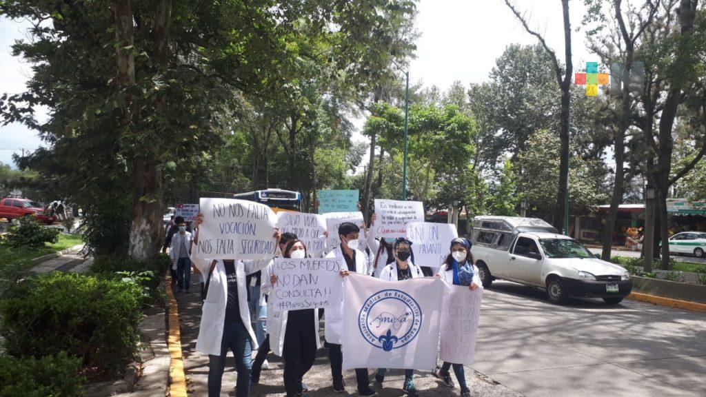 Xalapa, Ver.- Estudiantes de la Facultad de Medicina de la Universidad Veracruzana (UV) marcharon este miércoles en Xalapa para pedir a las autoridades educativas, que sean seguros los lugares donde sean enviados a realizar su servicio social.