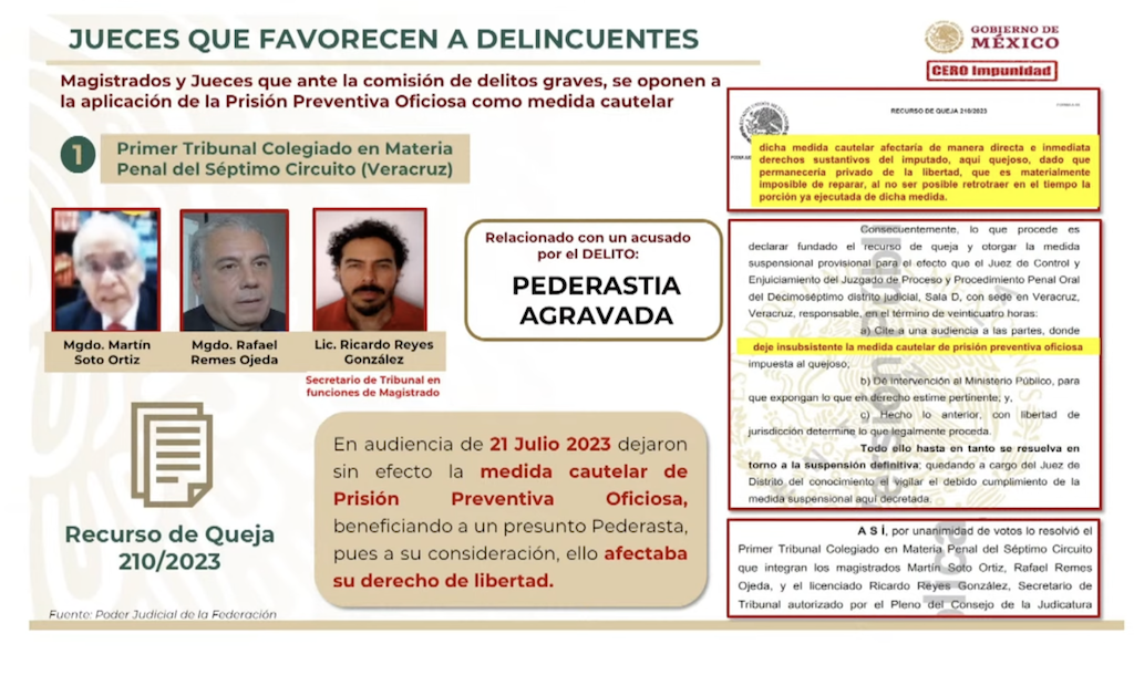 Los primeros expuestos fueron los magistrados del Tribunal Colegiado en Materia Penal del Séptimo Circuito. Martín Soto Ortiz, Rafael Remes Ojeda y Ricardo Reyes González por dejar sin efecto la prisión preventiva oficiosa contra una persona acusada de pederastia agravada porque según ellos “afectaba su derecho a la libertad”, esto el pasado 21 de julio.