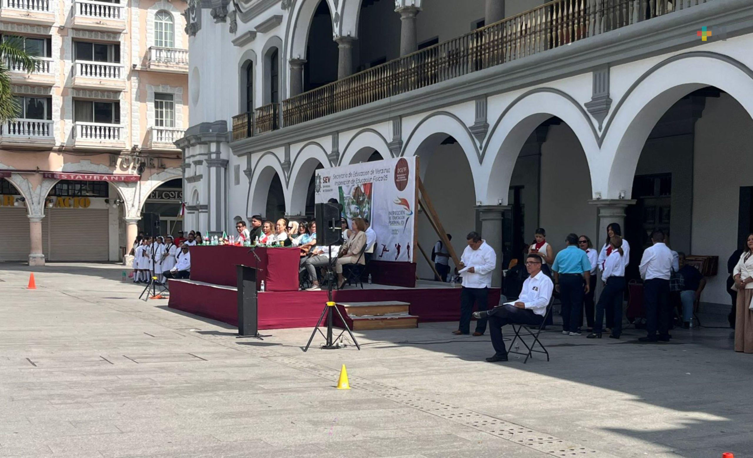 Veracruz, Ver.- La mañana de este viernes se llevó a cabo una demostración de escoltas en el Zócalo de la ciudad de Veracruz, donde participaron estudiantes de nivel primaria pertenecientes al sector 14.