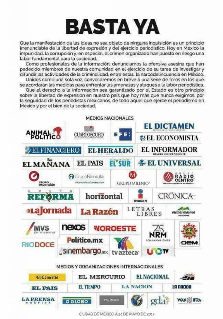 Cabe mencionar que entre los firmantes se encuentran: La Jornada, Animal Político, Televisa, TV Azteca, Grupo Reforma, El Universal, Efe, Cuartoscuro, El Financiero entre otros medios de comunicación.