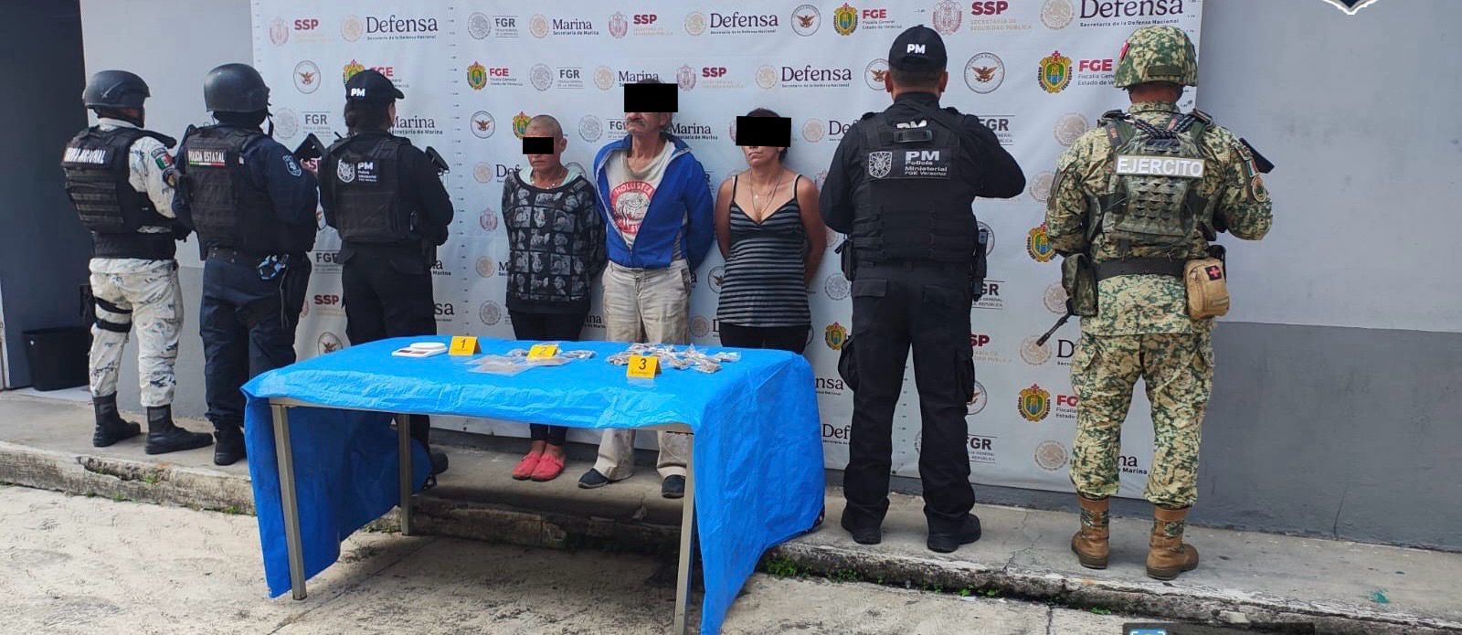 En el marco de la Estrategia de Seguridad Pública del Estado de Veracruz, tres personas fueron detenidas por delitos contra la salud en tres eventos distintos en Veracruz y Río Blanco, asegurándose 13 dosis de sustancia con características del cristal y un vehículo sin reporte de robo. En Coatzacoalcos cinco personas en posesión de 64 dosis de la misma sustancia, además de teléfonos móviles y armas blancas.
