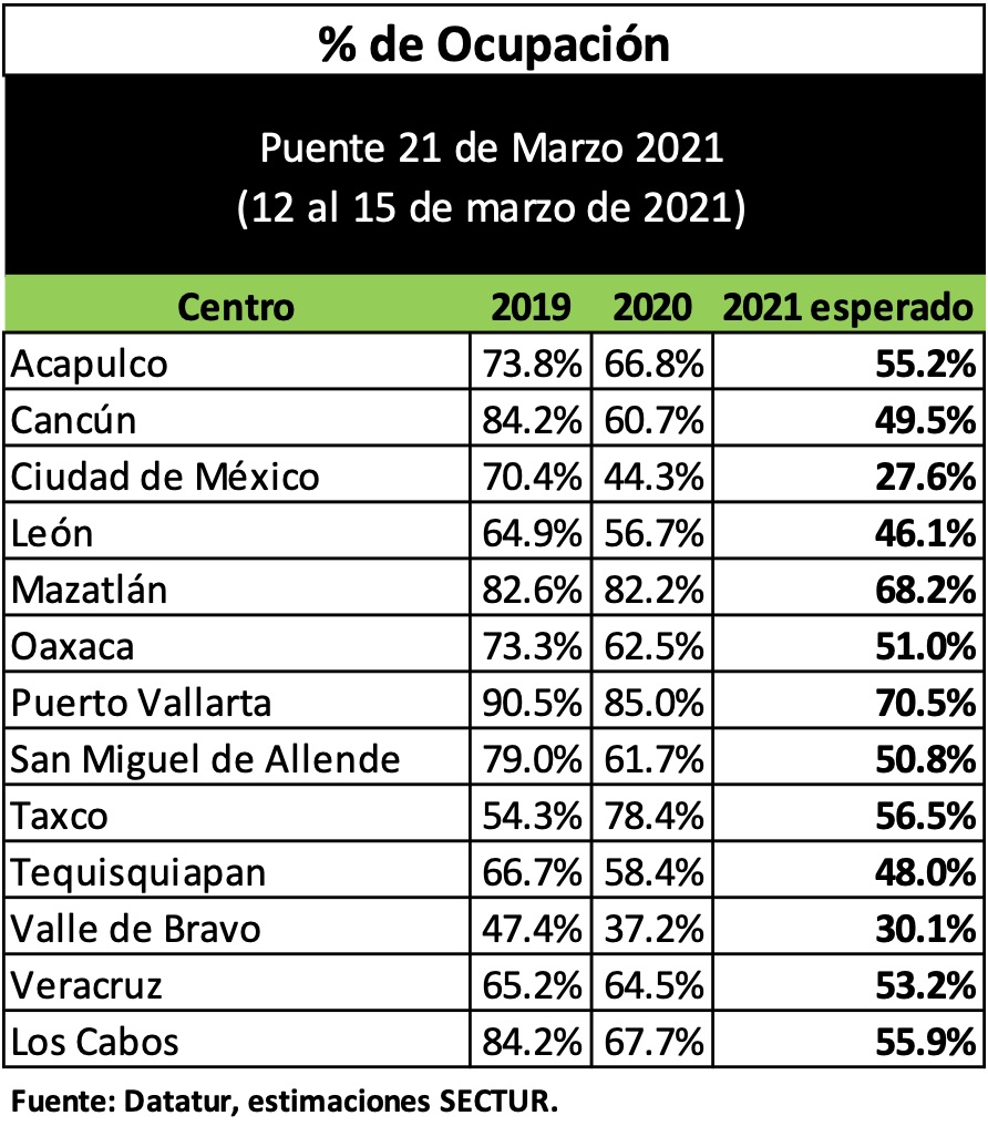 Indicó que para este periodo de asueto por la conmemoración del natalicio de Benito Juárez, el 21 de marzo, las expectativas muestran una recuperación de los porcentajes de ocupación hotelera con respecto a 2020, aunque no a los niveles del 2019. Para el caso de la Ciudad de México podría alcanzar una ocupación de 27.6 por ciento; la Zona Metropolitana de León, en Guanajuato, 46.1 por ciento; la ciudad de Oaxaca, 51 por ciento; y San Miguel de Allende, Guanajuato, 50.8 por ciento.