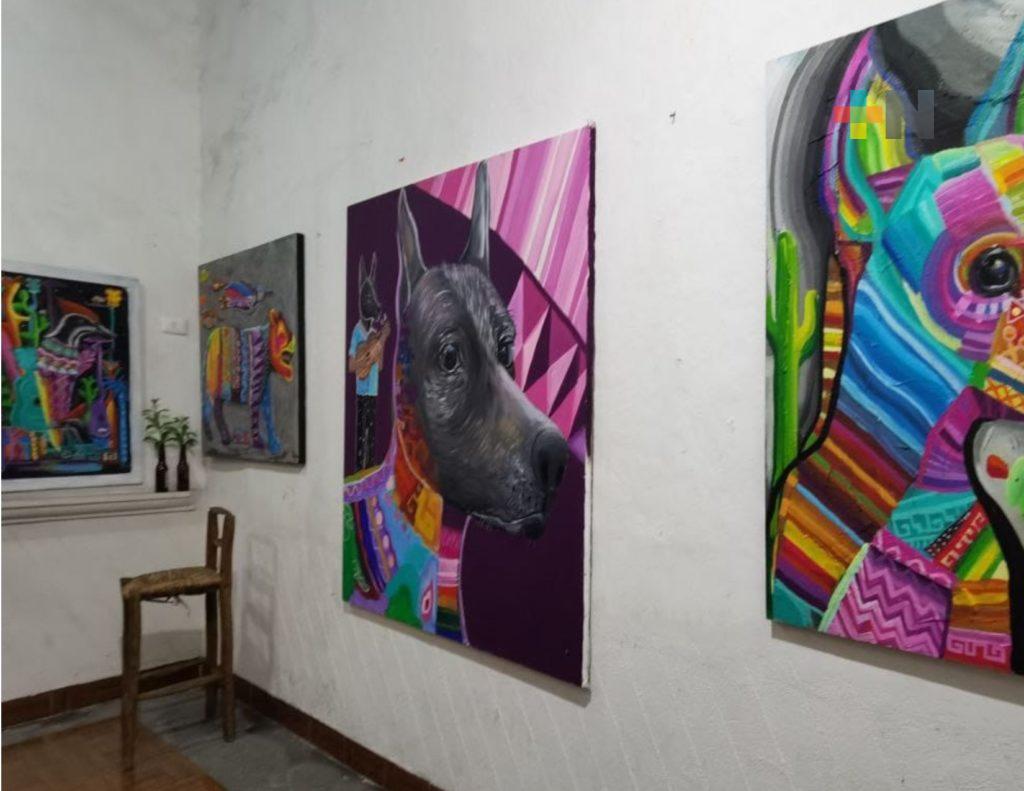 “Va enfocada mucho a la identidad del estado, de mi región y con ella conjugo las artes heredadas de los ancestros, como es el textil, las texturas en piedra, los colores. Mi día a día es poder plasmar, por ejemplo, un xoloitzcuintle vestido de una manera colorida, recordando a través de símbolos prehispánicos la identidad, pero también hago referencia a la música. En el son jarocho hay un son que en lo personal me gusta mucho, que se llama El Perro, por ahí pueden verlo con un instrumento y así sucesivamente voy poniendo elementos que tengan y me recuerden siempre de dónde vengo” explicó.