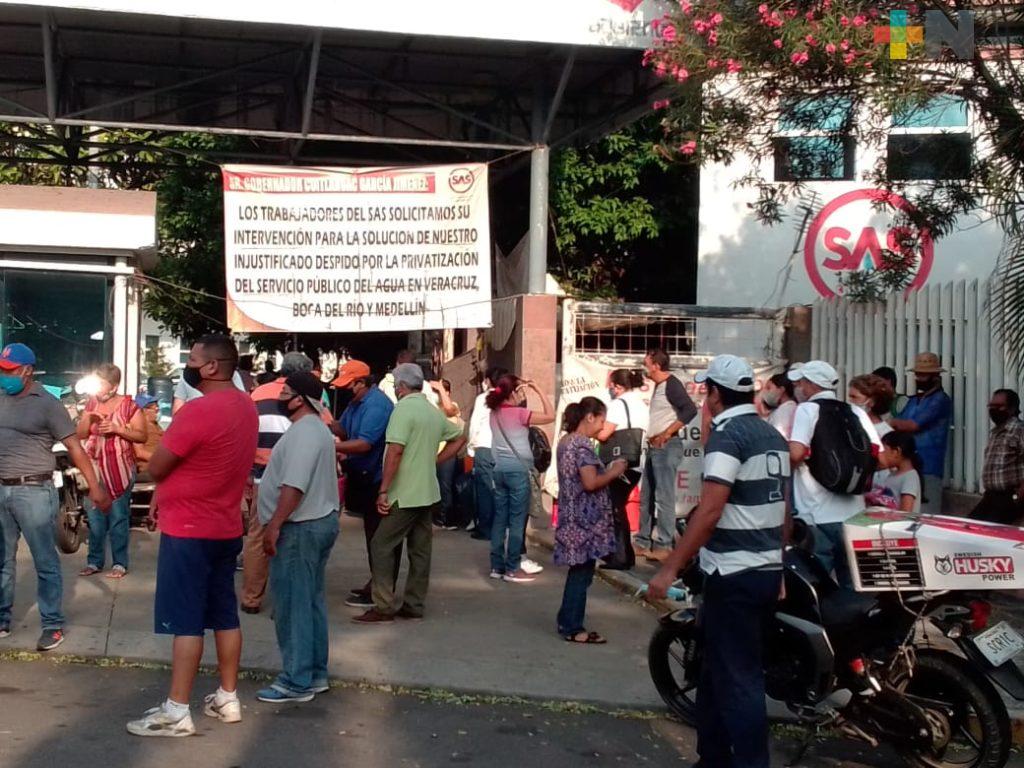 Veracruz, Ver.- Entre gritos y empujones, los extrabajadores del desaparecido Sistema de Agua y Saneamiento (SAS) se manifestaron en las instalaciones de Grupo MAS para señalar el presunto mal servicio que la empresa ofrecen a la ciudadanía.