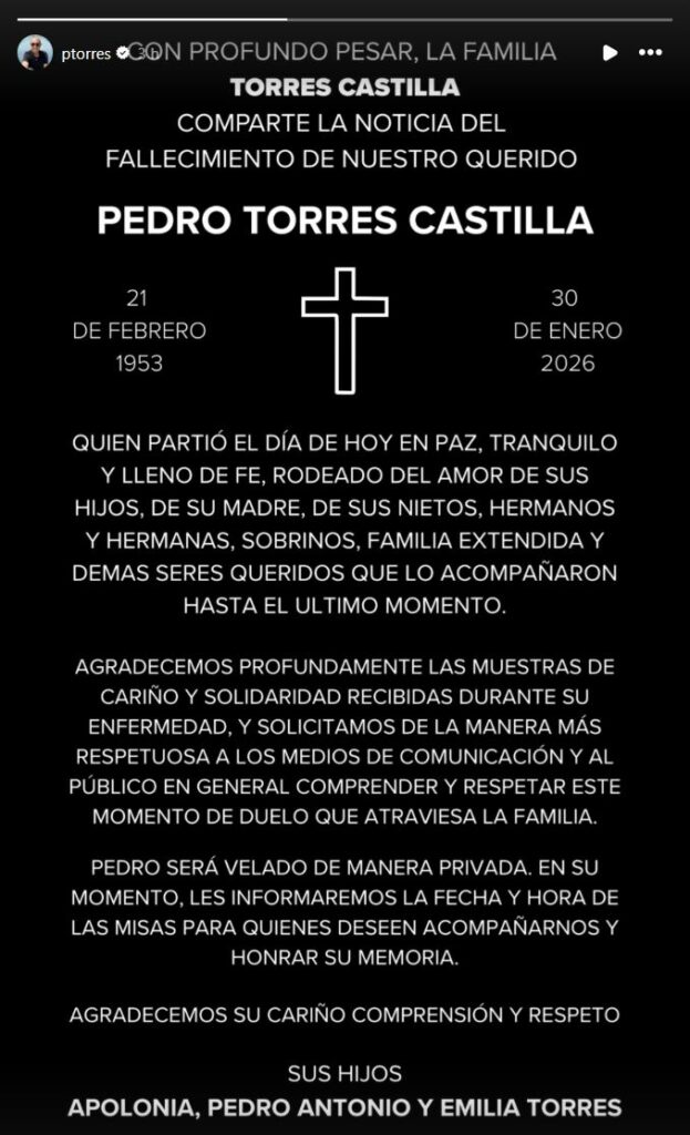 “Con profundo pesar, la familia Torres Castilla comparte la noticia del fallecimiento de nuestro querido Pedro Torres Castilla, 21 de febrero de 1953 – 30 de enero de 2026”, se lee en la publicación.