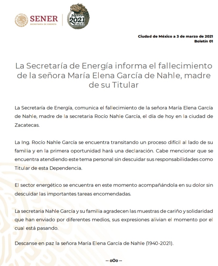 Ciudad de México.- A través de redes sociales y por parte de la Secretaría de Energía, fue confirmado el fallecimiento de María Elena García de Nahle, madre de Rocío Nahle García, en la ciudad de Zacatecas