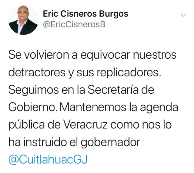 «Se volvieron a equivocar nuestros detractores y sus replicadores. Seguimos en la Secretaría de Gobierno. Mantenemos la agenda pública de Veracruz como nos lo ha instituido el gobernador @CuitlahuacGJ».