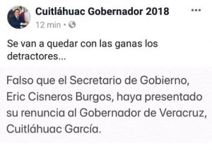 Xalapa, Ver.- A través de su cuenta personal de Twitter, el gobernador Cuitláhuac García Jiménez desmintió que el Secretario de Gobierno, Eric Cisneros Burgos, haya presentado su renuncia al cargo como se difundió en el transcurso de este sábado.