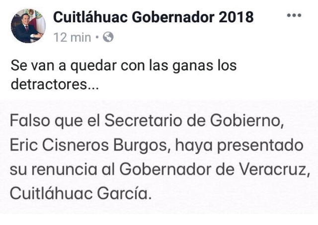 «Se van a quedar con las ganas los detractores. Falso que el Secretario de Gobierno, Eric Cisneros Burgos, haya presentado su renuncia al Gobernador de Veracruz, Cuitláhuac García», publicó el mismo Ejecutivo estatal, con lo que prácticamente dio por terminada la polémica.