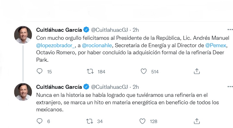 «Con mucho orgullo felicitamos al Presidente de la República, Lic. Andrés Manuel @lopezobrador_, a @rocionahle, Secretaria de Energía y al Director de @Pemex, Octavio Romero, por haber concluido la adquisición formal de la refinería Deer Park.