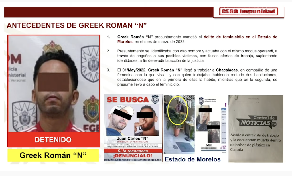 «Podemos señalar que Greek N es un feminicida serial, hay cuando menos 7 casos que pudieran estar vinculado», refirió.