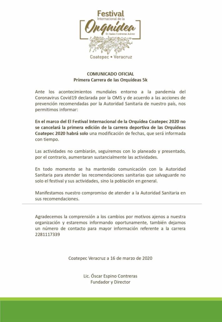 De igual forma informó que la primera edición de la Carrera de las Orquídeas 5K, tampoco se suspenderá y solo cambiará de fecha.