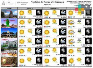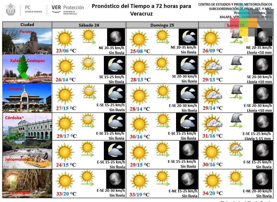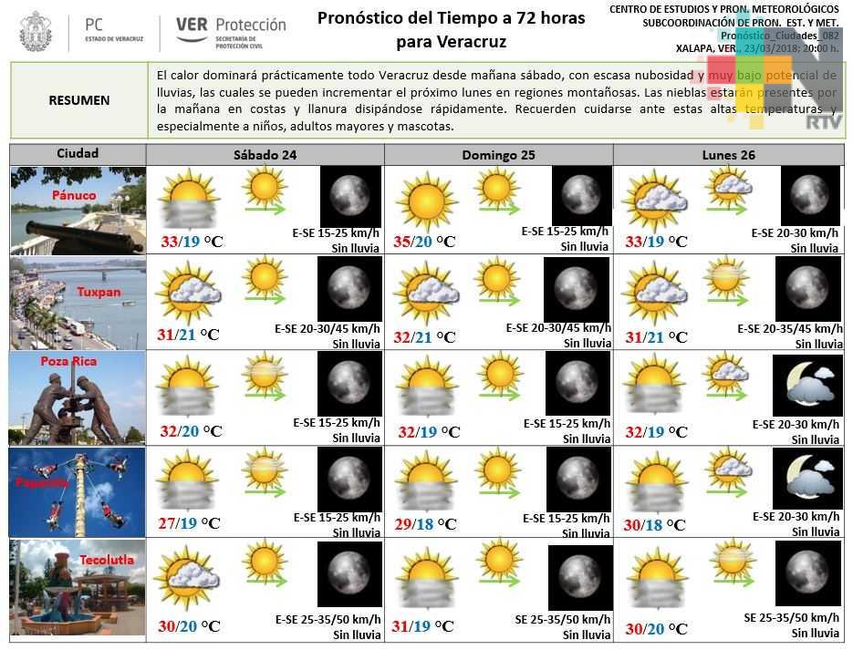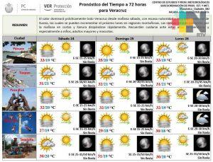 El calor dominará prácticamente todo Veracruz desde mañana sábado, con escasa nubosidad y muy bajo potencial de lluvias, las cuales se pueden incrementar el próximo lunes en regiones montañosas. Las nieblas estarán presentes por la mañana en costas y llanura disipándose rápidamente. Protección Civil recomienda cuidarse ante estas altas temperaturas, especialmente a niños, adultos mayores y mascotas.