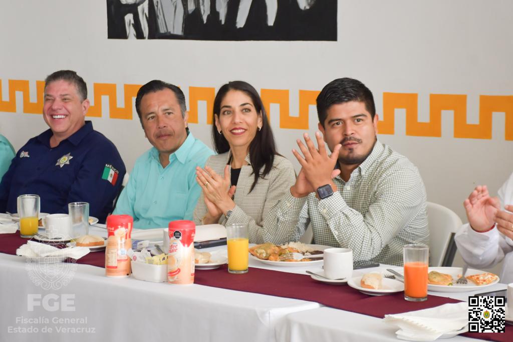 En instalaciones del Centro de Estudios e Investigación en Seguridad, acompañó al Gobernador del Estado, Cuitláhuac García Jiménez y al Secretario de Seguridad Pública, Hugo Gutiérrez Maldonado, aprovechando la ocasión para convivir con quienes diariamente informan a las y los veracruzanos.