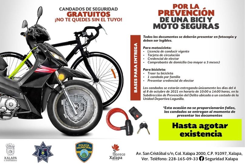 Xalapa, Ver.- Como parte de las políticas públicas para la prevención del delito, desde este lunes hasta el viernes 8 de octubre se desarrollará la segunda etapa de la estrategia Tu Moto, Tu Bici Segura, mediante la que se otorgarán candados a usuarias y usuarios de este tipo de transporte en el municipio.