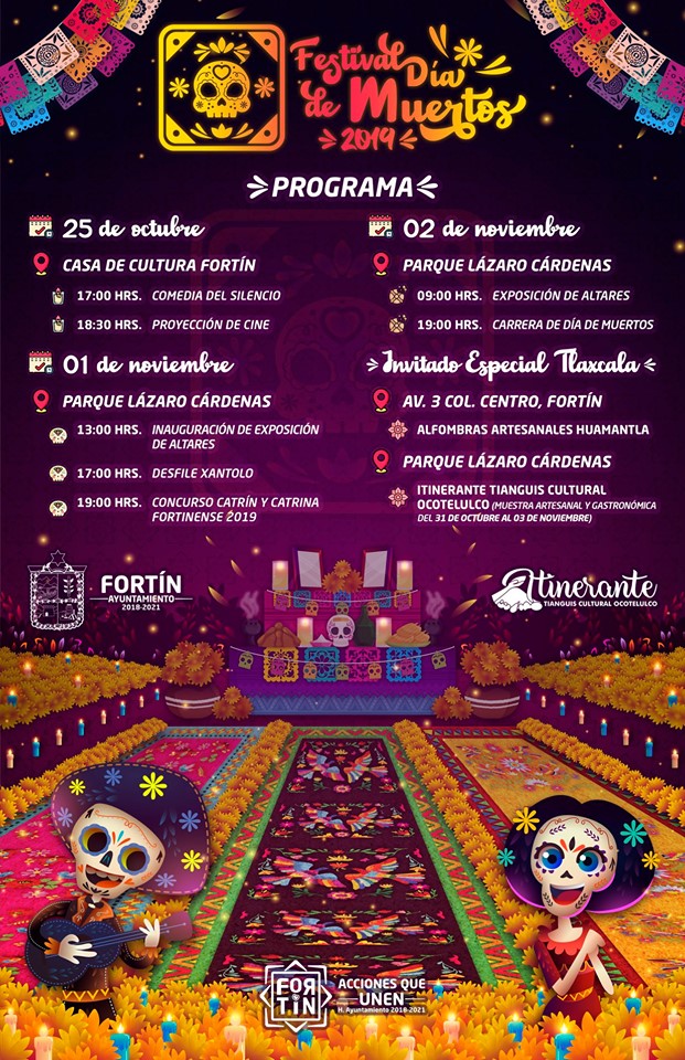 Fortín, Ver.- En el municipio de Fortín se realizará el Festival de Día de Muertos 2019, en donde habrá la exposición de altares, bailes regionales, eventos musicales y la participación especial de un tianguis cultural.