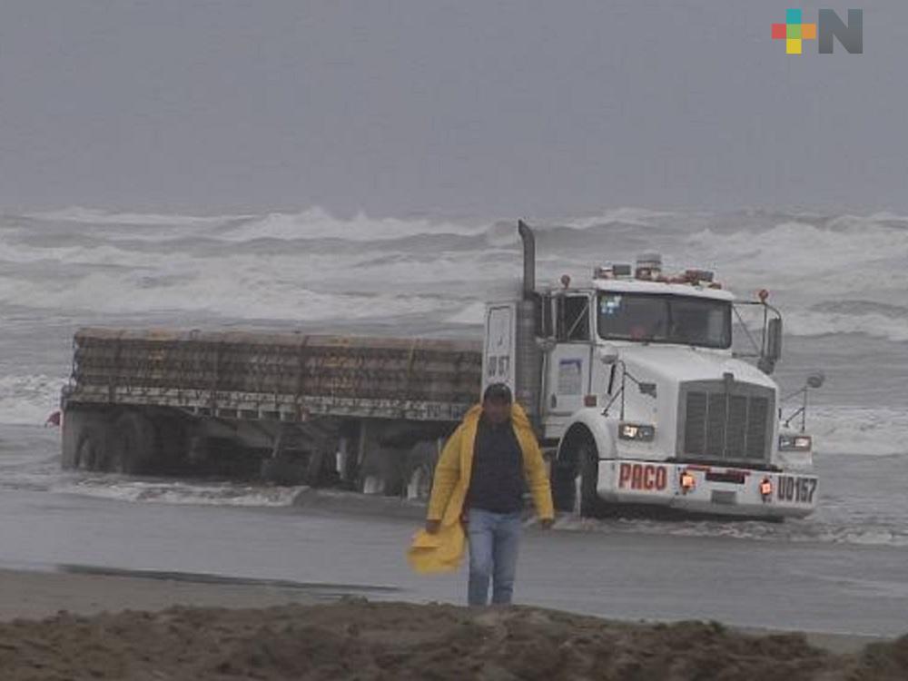 Coatzacoalcos, Ver.- Uno de los tráilers que descargaba tapetes de concreto en la playa de Coatzacoalcos fue arrastrado hacia el agua debido al fuerte oleaje que persiste a consecuencia del Frente Frío número 41.