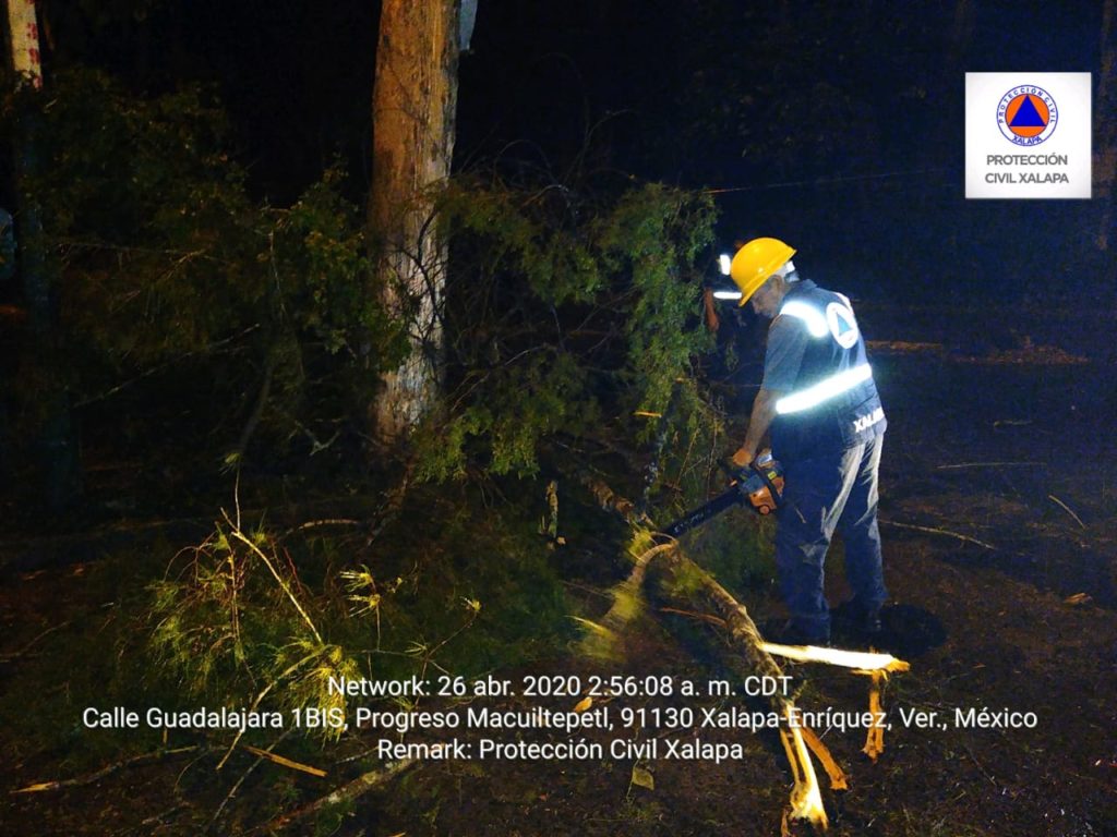 Xalapa, Ver.- Derivado de la fuerte lluvia de la noche y madrugada del domingo 26 de abril, la Dirección de Protección Civil municipal de Xalapa, reporta que solo se tuvieron encharcamientos en calles y no hubo afectación a casas habitación, asimismo se atendieron dos reportes de caída de árbol, uno en la colonia Progreso Macuiltépetl y otro en circuito Aguirre Beltrán en la zona universitaria, los cuales se procedió a su retiro de inmediato.