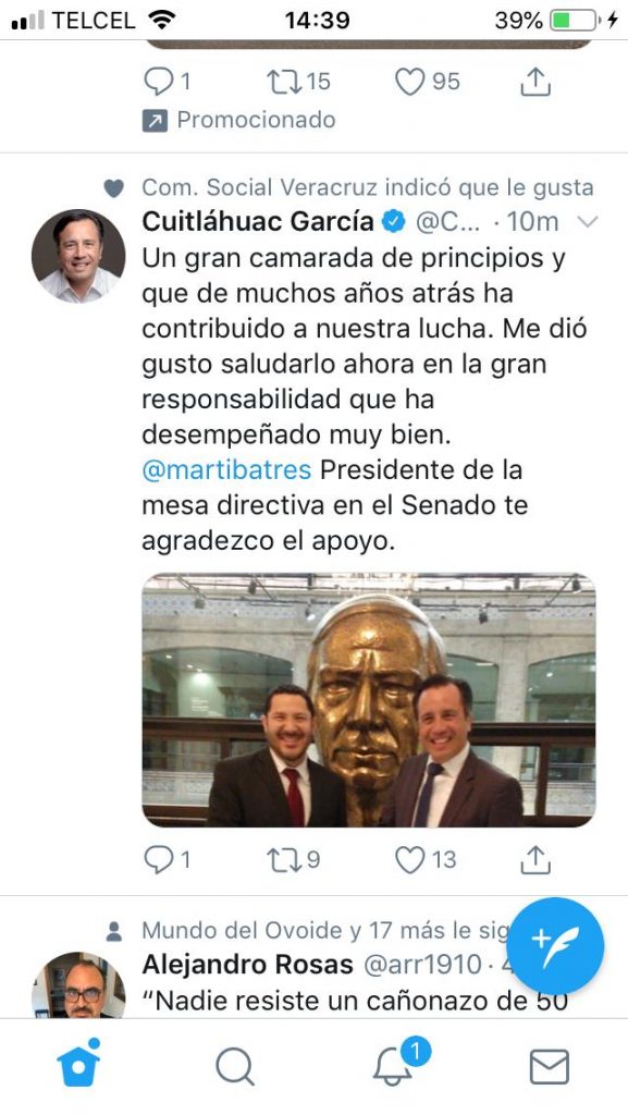 México.- El gobernador Cuitláhuac García a través de su cuenta de Twitter mandó un mensaje de agradecimiento al presidente de la Mesa Directiva en el senado Martí Batres Guadarrama, por el apoyo recibido durante estos años de lucha.