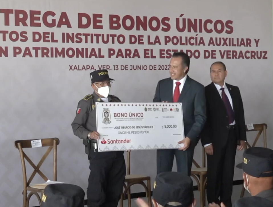 Xalapa, Ver.- El Gobernador del Estado, Cuitláhuac García Jiménez entregó bonos únicos a elementos del Instituto de la Policía Auxiliar y Protección Patrimonial para la entidad.