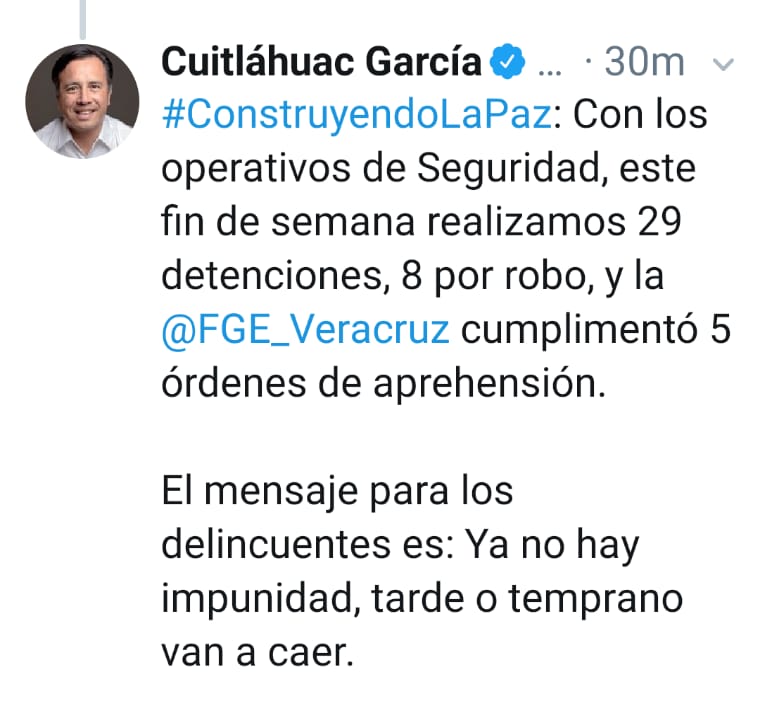En el tuiter de Cuitláhuac García se lee: «El mensaje para los delincuentes es: Ya no hay impunidad, tarde o temprano van a caer».