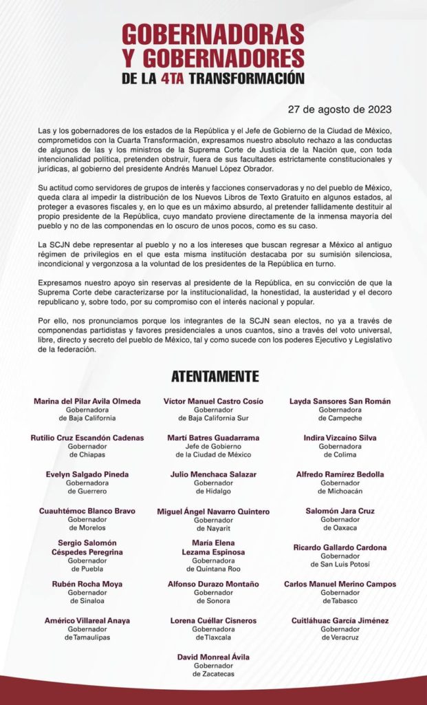 Xalapa, Ver.- El gobernador Cuitláhuac García Jiménez, a través de sus redes sociales expresó su absoluto rechazo a las conductas de algunos de las y los ministros de la Suprema Corte de Justicia de la Nación (SCJN) que, con toda intencionalidad política, pretenden obstruir, fuera de sus facultades estrictamente constitucionales y jurídicas, al gobierno del presidente Andrés Manuel López Obrador.