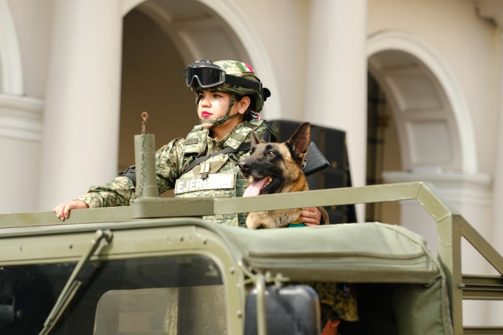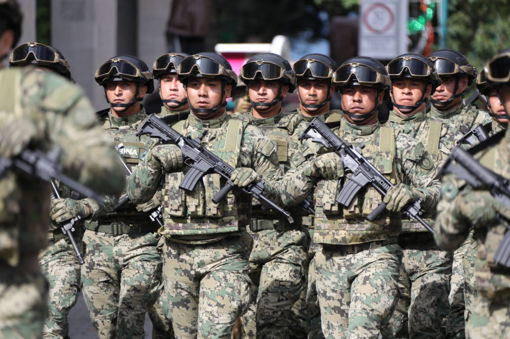 En representación de las fuerzas armadas, 695 elementos del Ejército, la Guardia Nacional y la Armada de México desfilaron con 28 vehículos terrestres, dos embarcaciones, siete binomios canófilos, ocho jinetes montados y una bandera de guerra.