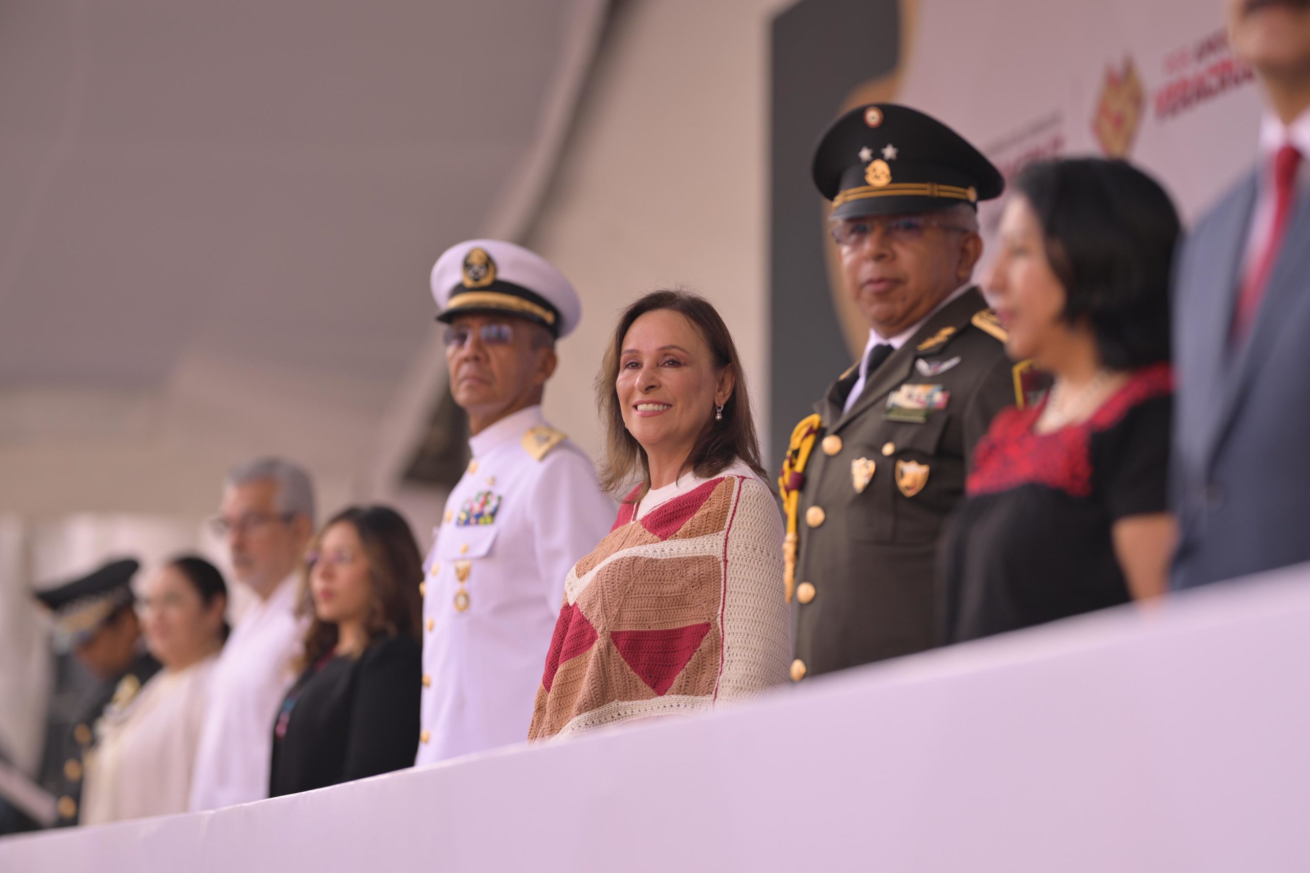 En el presídium acompañaron a la Gobernadora los comandantes de la Primera Región Naval, Ramiro Lobato Camacho, y de la 26ª Zona Militar, Miguel Ángel Rodríguez Gutiérrez; las presidentas de la Mesa Directiva del Congreso del Estado, Naomi Edith Gómez Santos, y del Tribunal Superior de Justicia, Rosalba Hernández Hernández.