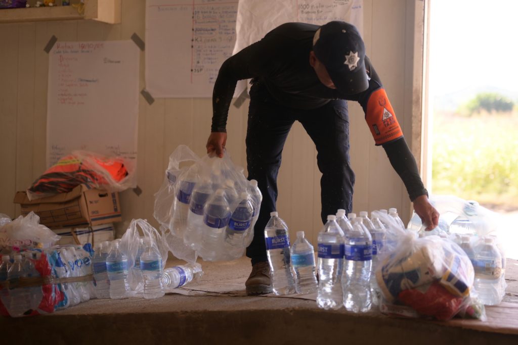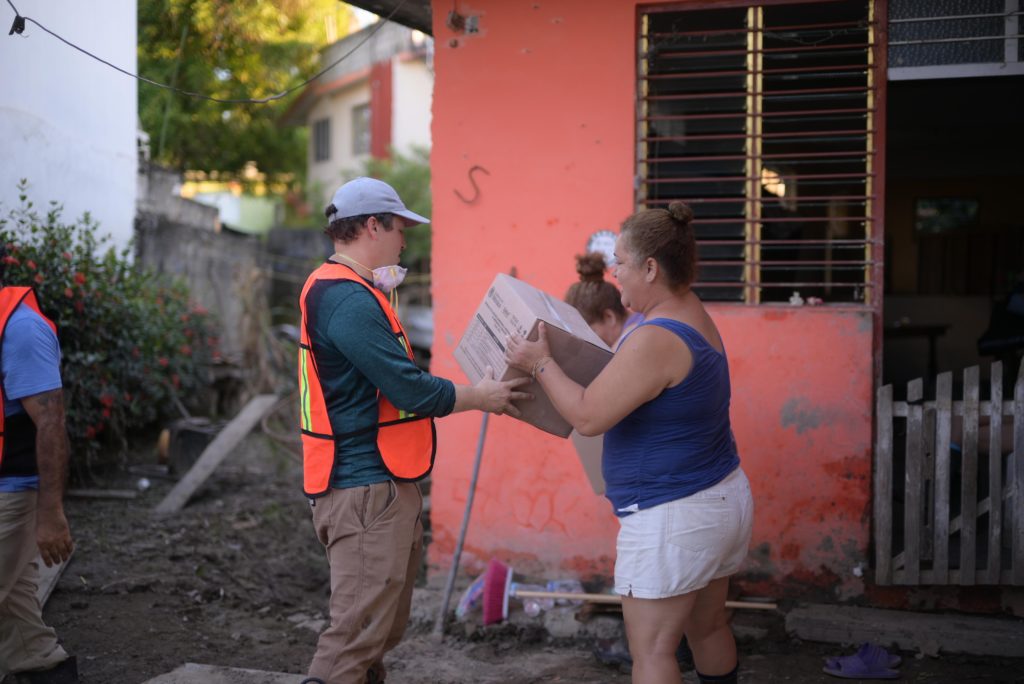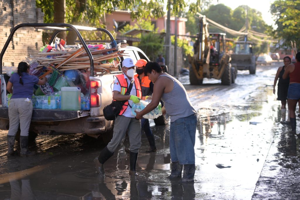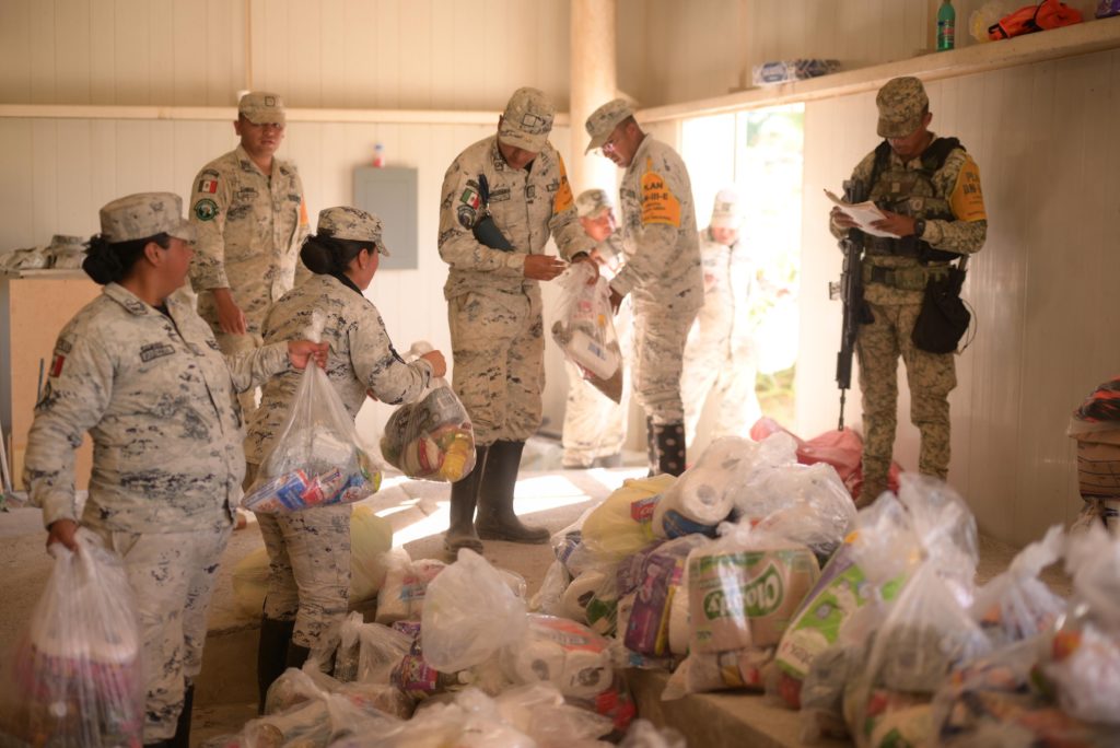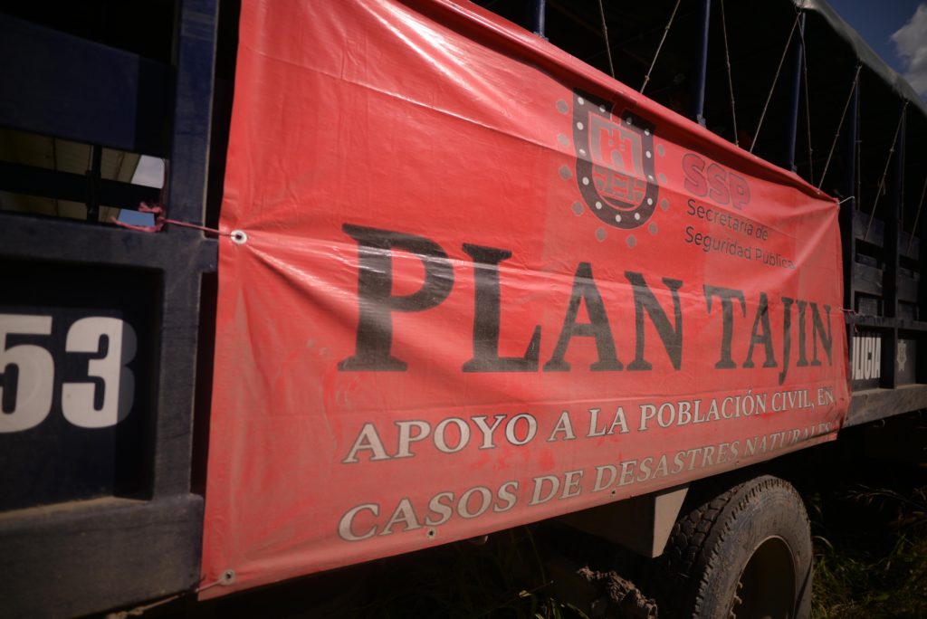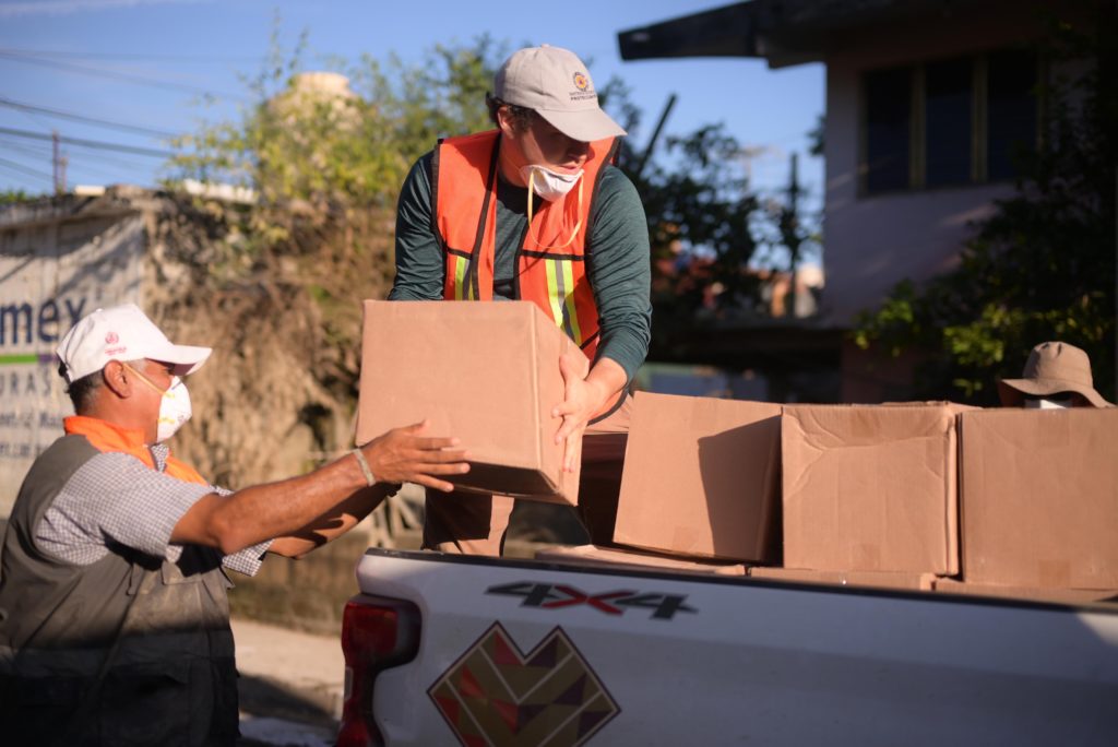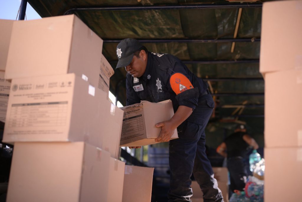 En la bodega de resguardo de insumos, verificó el avance en la entrega de paquetes alimentarios, agua y productos de limpieza, e instruyó a las brigadas a continuar la distribución casa por casa; desde este punto partieron unidades con 527 paquetes alimenticios, 633 litros de agua purificada y 15 galones de desinfectante de 20 litros cada uno, destinados a los hogares más afectados.