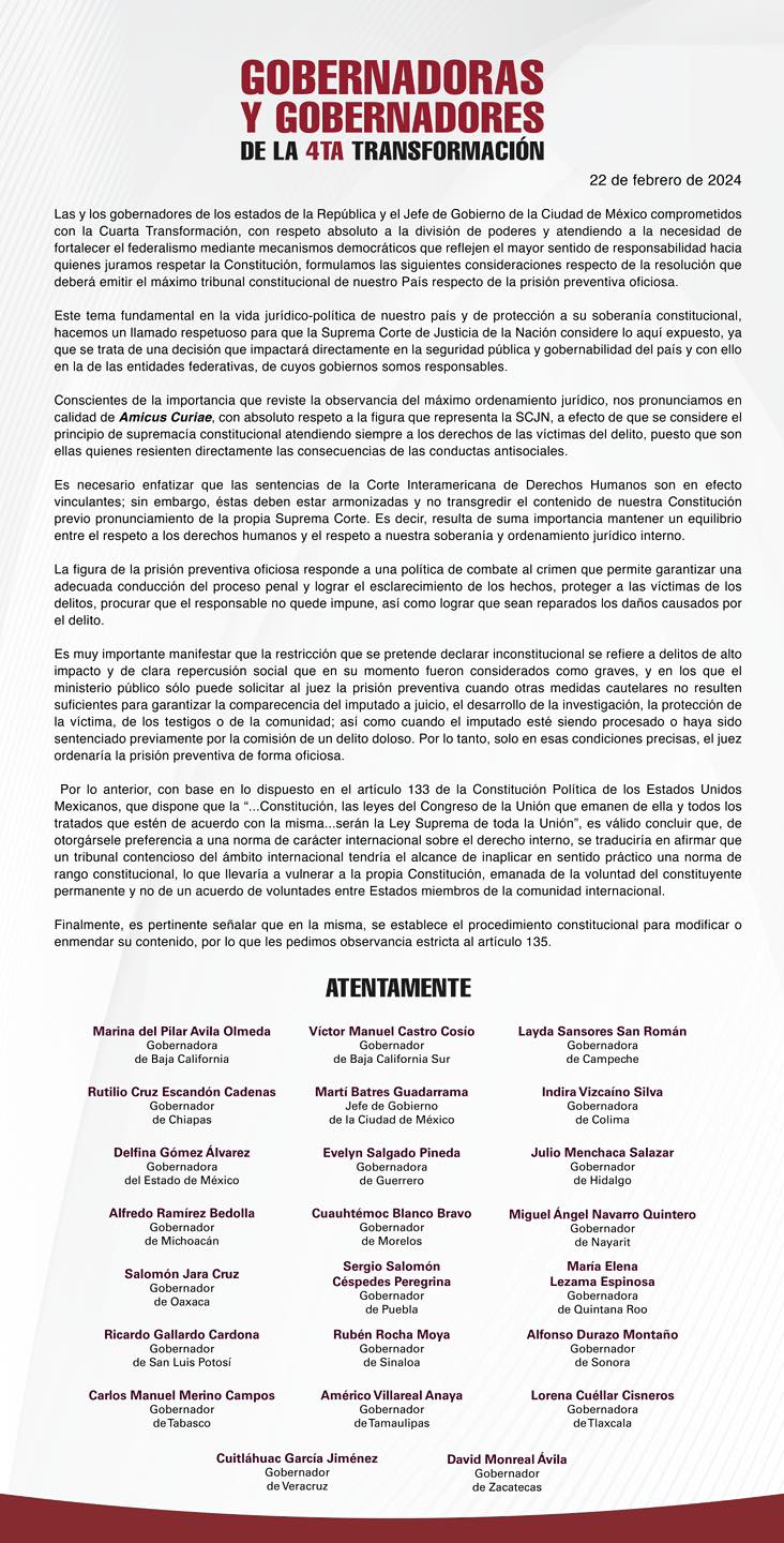 Xalapa, Ver.- Sobre la resolución del máximo tribunal del país ante la prisión preventiva oficiosa, las y los mandatarios estatales de la Cuarta Transformación hicieron un nuevo llamado mediante posicionamiento conjunto a la Suprema Corte de Justicia de la Nación: considerar el principio de supremacía constitucional atendiendo siempre los derechos de las víctimas del delito.