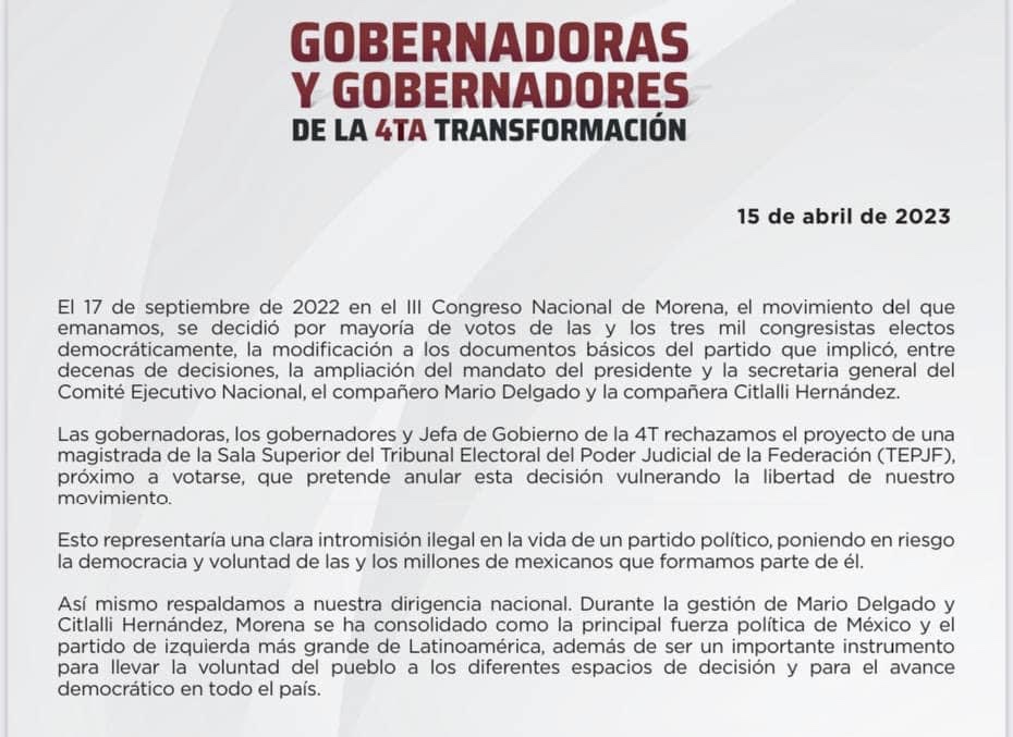 Las gobernadoras, gobernadores y jefa de Gobierno de la 4T rechazan el proyecto de la magistrada Janine Otálora, que plantea declarar inconstitucional la ampliación del mandato de Delgado Carrillo y Hernández Mora como presidente y secretaria General de Morena; respectivamente.