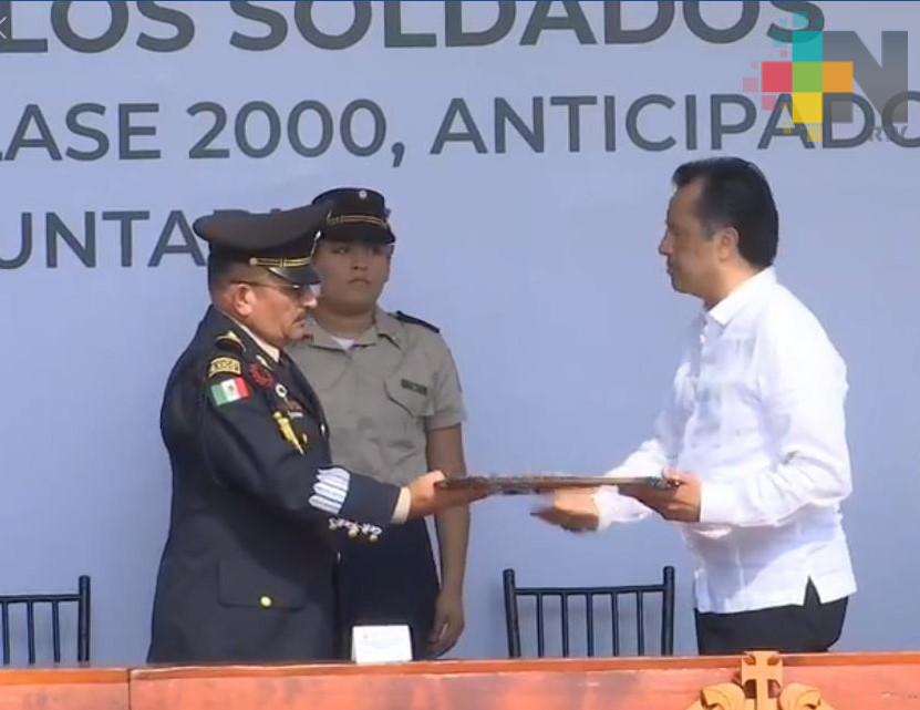 Emiliano Zapata, Ver.- En la conmemoración de la batalla del 5 de mayo en el campo militar del 63 batallón de infantería ubicado en El Lencero y protesta de bandera del Servicio Militar Nacional, el gobernador Cuitláhuac García Jiménez reconoció la labor que lleva a cabo el Ejército Mexicano en acciones de seguridad, he hizo entrega al general de brigada Federico Eduardo Solórzano Barragán de 25 patrullas para apoyar las labores en seguridad que brinda personal a su cargo.
