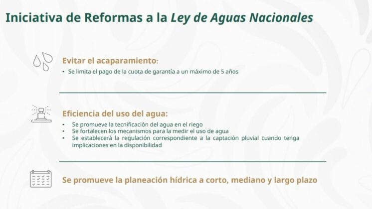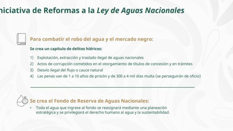 “Se recupera para la nación este gran recurso natural, indispensable para el desarrollo y se recupera el derecho al agua. Deja de ser una mercancía y se convierte en un instrumento de la nación, porque el agua es de la nación, es concesionable, pero de manera ordenada, eficiente y que permita garantizar el derecho humano al agua”, detalló.