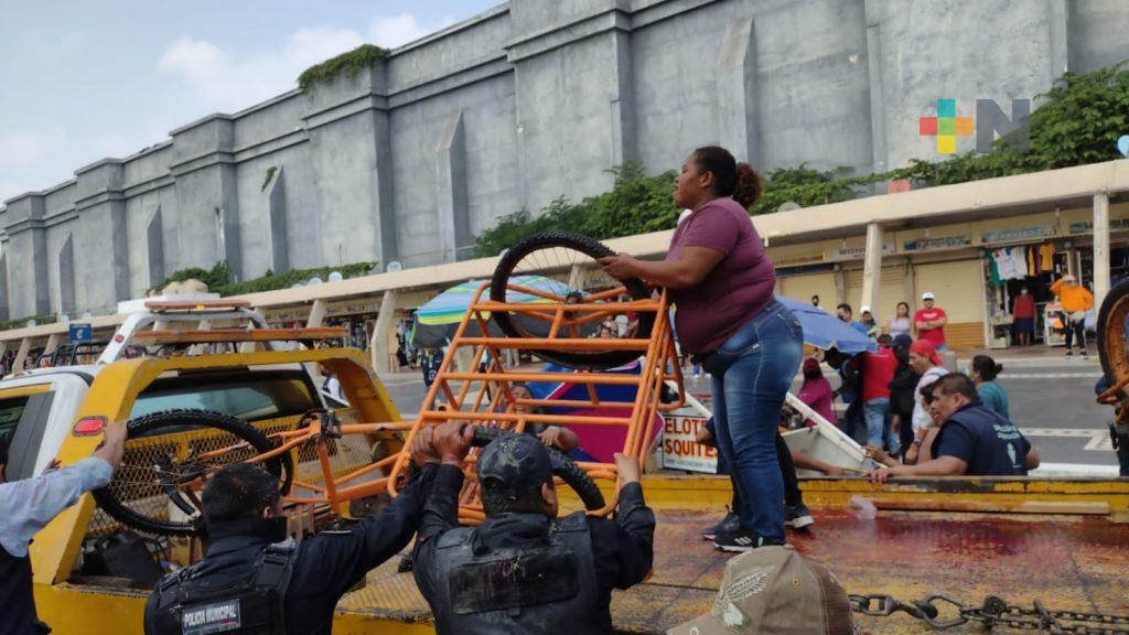 Un grupo de comerciantes quisieron instalarse en sus antiguos puestos de trabajo del Malecón de Veracruz, sin embargo fueron retirados con uso de la fuerza pública.