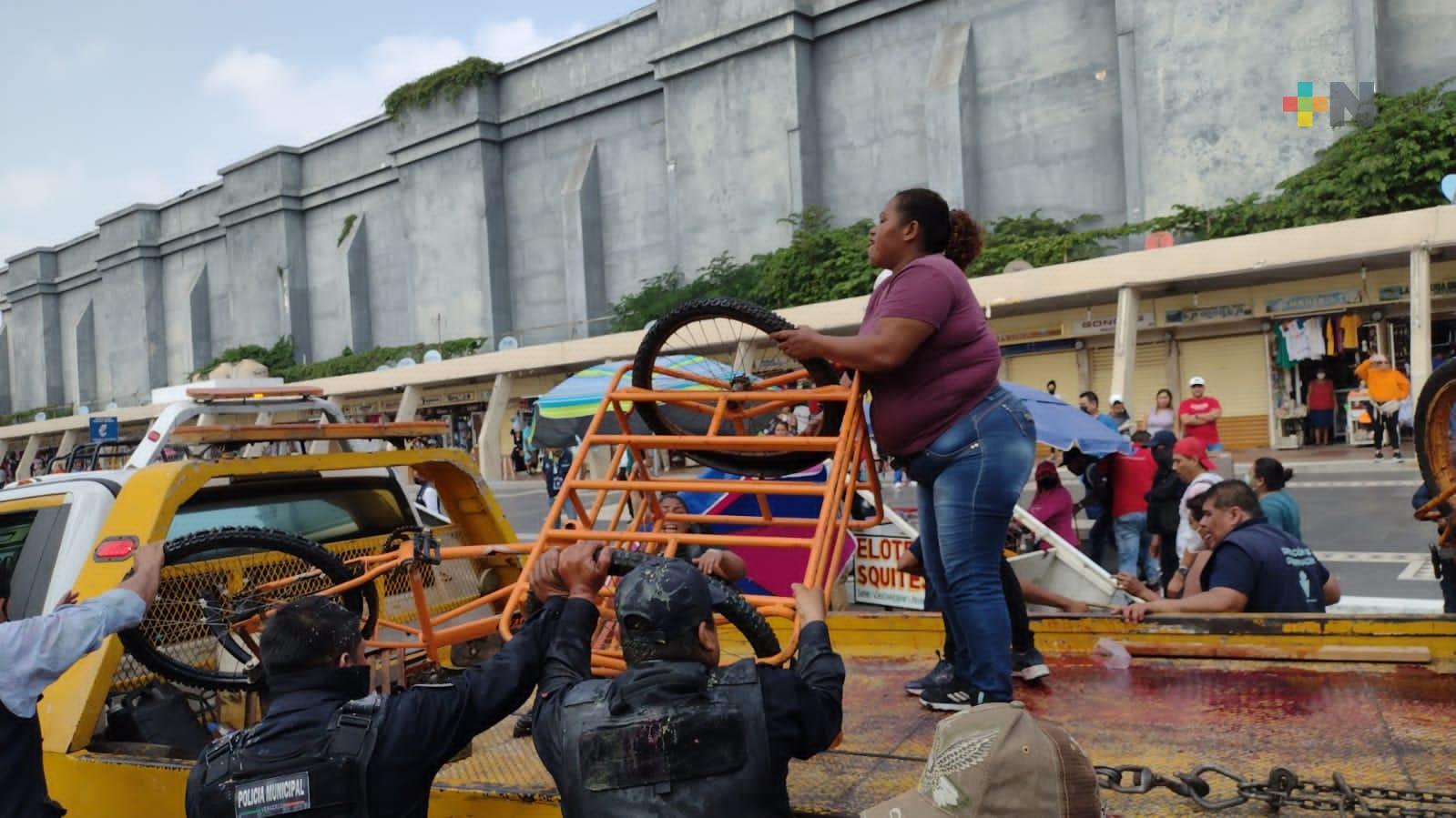 Veracruz, Ver.- Por lo menos tres detenidos, algunas personas golpeadas y daños materiales, fue el saldo que dejó el desalojo de vendedores ambulantes por parte de elementos de la Policía municipal y las direcciones de Comercio y Gobernación del Ayuntamiento de Veracruz.
